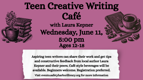 Aspiring teen writers can share their work and get tips and constructive feedback from local author Laura Kepner and their peers. Café style beverages will be available. Beginners welcome. Registration preferred in order to anticipate how much coffee and tea to provide.