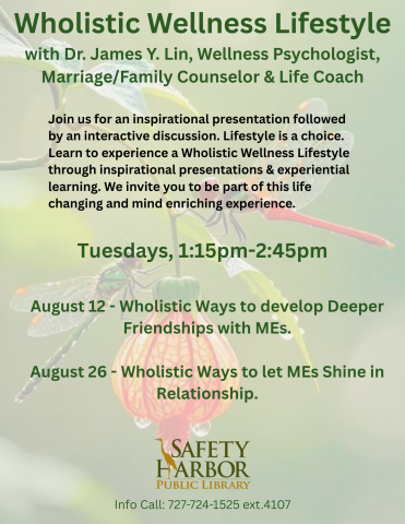 This event is in the "Families" group This event is in the "Adults" group This event is in the "Seniors" group This event is in the "Everyone" group Wholistic Wellness Lifestyle Tuesday, December 16, 2025 at 1:15pm - 2:45pm Meeting Room A/B (1st Floor) at Safety Harbor Public Library Program Type: Educational, Lectures, Special Events, Workshops Age Group: Families, Adults, Seniors, Everyone Join us for an inspirational presentation followed by an interactive discussion. Lifestyle is a choice. Learn to experience a Wholistic Wellness Lifestyle through inspirational presentations & experiential learning. View Details This event is in the "Families" group This event is in the "Adults" group This event is in the "Seniors" group This event is in the "Everyone" group Dec 16 2025 Tue Wholistic Wellness Lifestyle 1:15pm–2:45pm Educational, Lectures, Special Events, Workshops Library Branch: Safety Harbor Public Library Room: Meeting Room A/B (1st Floor) Age Group: Families, Adults, Seniors, Everyone Program Type: Educational, Lectures, Special Events, Workshops Event Details: Join us for an inspirational presentation followed by an interactive discussion. Lifestyle is a choice. Learn to experience a Wholistic Wellness Lifestyle through inspirational presentations & experiential learning.